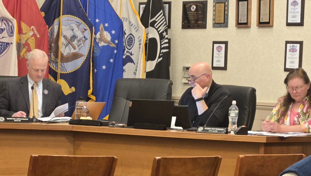Former Acting City Manager Brian Phinney (center) listens as former Mayor Marty Grohman reads an item during a 2025 council meeting. City Clerk Robin Patterson is seated at Phinney’s right side. (Seaver photo)