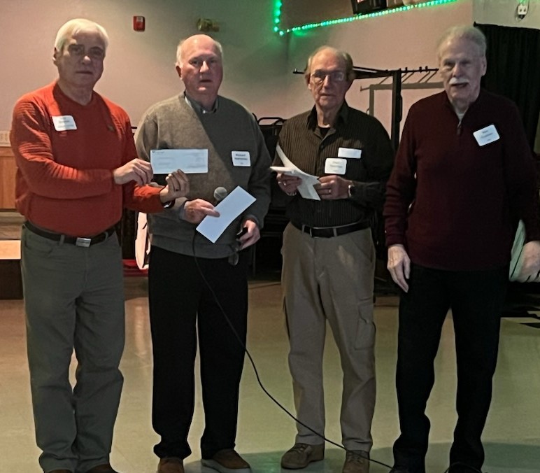Don Bisson of the Biddeford Food Pantry (far left) receives a $20,000 donation from the St. Louis Alumni Association, represented by (L-R) Richard Dutremble, Paul Therrien and Don Couture. The Association also donated $25,000 to the My Place Teen Center in Biddeford and $5,000 to Apex Youth Connection. (Contributed photo)