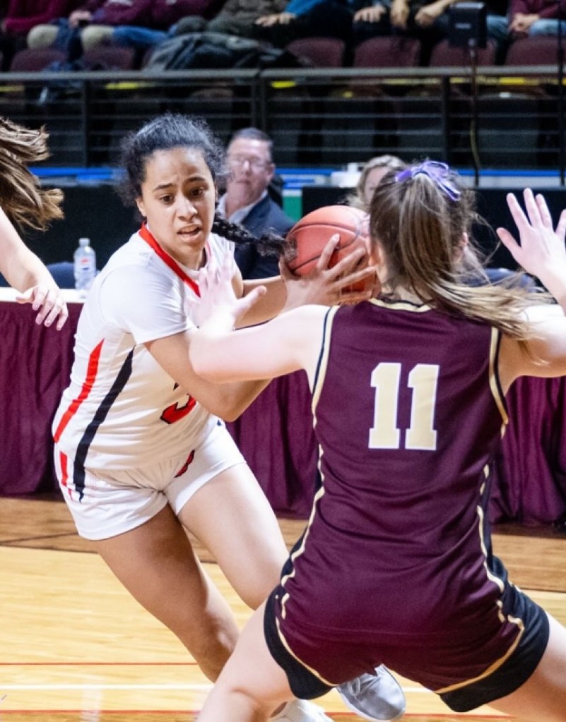 Ayla Lagasse looks for three during Saturday’s state championship game (Photo: Maureen Grandmaison Photography)